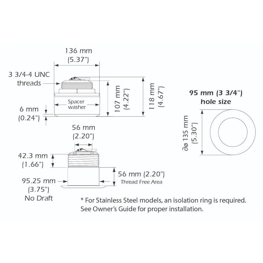 - Hole size: Fiberglass or wood hull 3 3/4″ (95 mm), Metal hull 4 1/8″ (105 mm)